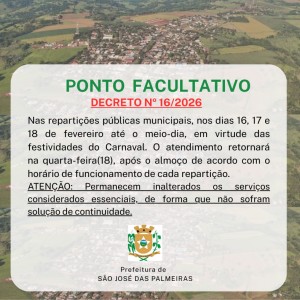 CARNAVAL 2026: PREFEITURA DECRETA PONTO FACULTATIVO NAS REPARTIÇÕES PÚBLICAS MUNICIPAIS NOS DIAS 16, 17 E 18 DE FEVEREIRO