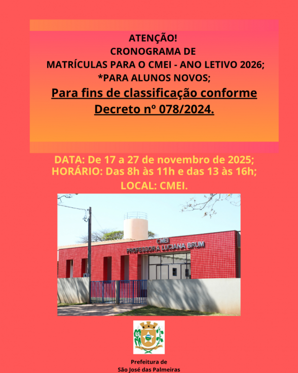A Secretaria de Educação, Cultura e Esportes de São José das Palmeiras informa aos pais e/ou responsáveis sobre o cronograma de matrículas para alunos novos, no Centro Municipal de Educação Infantil (CMEI) - Professora Luciana Brum, para o ano letivo de 2026.