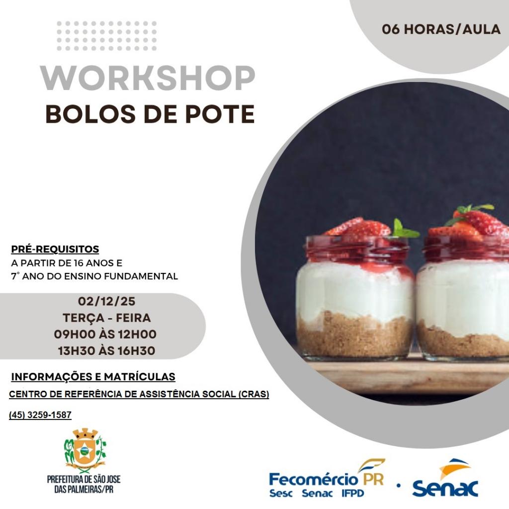 A Secretaria de Assistência Social de São José das Palmeiras informa às famílias sãojosélieses atendidas pelo Centro de Referência de Assistência Social (CRAS), que estão abertas as inscrições para um Workshop de Bolos no Pote, com a carga horária de 06 horas/aula.